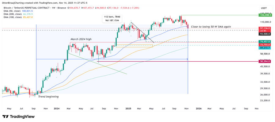 درصورتیکه قیمت تا پایان هفته دوباره به بالای ۱۰۱,۰۰۰ بازنگردد، بیتکوین زیر میانگین متحرک سادهی ۵۰ هفته بسته خواهد شد؛ سطحی کلیدی که از سپتامبر ۲۰۲۳ نقش ستون حمایت روند صعودی را داشته است.