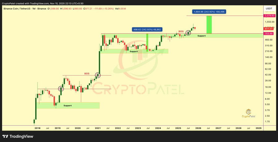 در چرخه قبلی، بین فوریه ۲۰۲۴ تا سپتامبر ۲۰۲۵، قیمت بایننسکوین از حدود ۲۹۳ دلار به ۱،۰۸۶ دلار رسید. اکنون نیز به نظر میرسد BNB در حال ساخت همان الگوی «تثبیت و جهش» است.