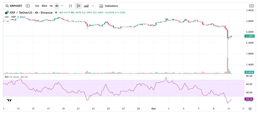 اکنون تمرکز بازار روی حفظ حمایت ۲.۳۰ دلاری XRP است. شاخص قدرت نسبی (RSI) در سطح ۲۴ قرار دارد که نشاندهنده شرایط اشباع فروش و احتمال بازگشت کوتاهمدت است. در صورت حفظ این حمایت و عبور قیمت از ۲.۸۰ دلار، ریپل میتواند روند صعودی خود را باز یابد، اما شکست این حمایت میتواند به سقوط تا ۲.۰۰ یا حتی ۱.۵۶ دلار منجر شود.