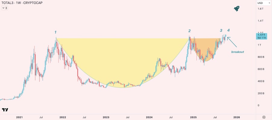 بازار آلتکوینها بار دیگر نشانههای صعودی قدرتمندی از خود نشان میدهد. شاخص توتال ۳ (TOTAL3) که ارزش کل رمزارزها به جز بیتکوین و اتریوم را اندازهگیری میکند، روز دوشنبه به رکورد تاریخی ۱.۱۸ تریلیون دلار رسید و بالاترین سطح بسته شدن کندل هفتگی خود را ثبت کرد. این روند، همراه با کاهش چشمگیر دامیننس تتر (USDT) به ۴.۱۸ درصد، نشان میدهد سرمایهگذاران بخشی از نقدینگی خود را از استیبلکوینها خارج و به آلتکوینها منتقل میکنند.