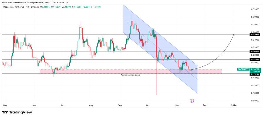 قیمت دوج کوین اکنون در محدوده ۰.۱۵ تا ۰.۱۶ دلار در نوسان است. اگر DOGE بتواند کانال نزولی را بشکند، اهداف بعدی آن ۰.۱۸۸ دلار، ۰.۲۰۹ دلار و حتی ۰.۲۵۴ دلار خواهد بود.