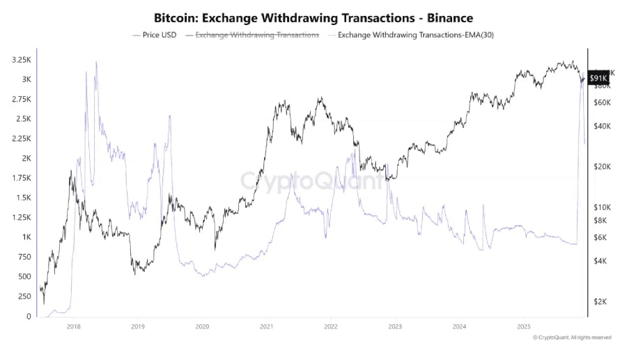 بایننس نمونه بارز این تغییر است؛ جریان ورودی و خروجی بیتکوینها در این صرافی دیگر متوازن نیست و برداشتها به بالاترین سطح از ماه می ۲۰۱۸ تاکنون رسیده است. همزمان، میانگین واریز بیتکوین به این صرافی به پایینترین سطح خود از سال ۲۰۱۷ تاکنون سقوط کرده است.