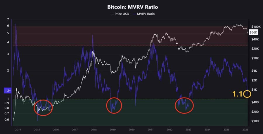با این حال، دادههای آنچین تصویر متفاوتی ارائه میدهند. نسبت ارزش بازار به ارزش واقعی (MVRV) به ۱.۱ رسیده و به محدوده «ارزشگذاری پایین» نزدیک شده؛ محدودهای که در چهار دوره گذشته پیشدرآمد رالیهای قدرتمند بوده است. این وضعیت معمولاً نشاندهنده فاز انباشت تدریجی است، نه پایان روند.