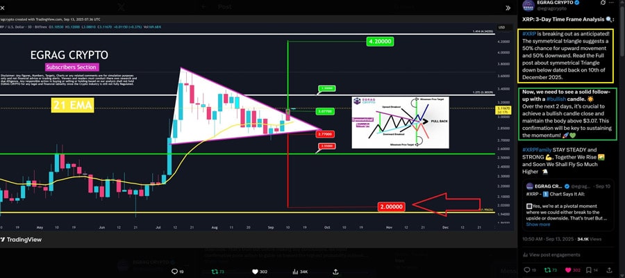 در روزهای اخیر، بحثها درباره روند قیمت ریپل (XRP) دوباره داغ شده است. طبق تحلیلهای تازه از اگرگ کریپتو (EGRAG Crypto)، این ارز دیجیتال در حال آماده شدن برای یک حرکت صعودی بزرگ است.