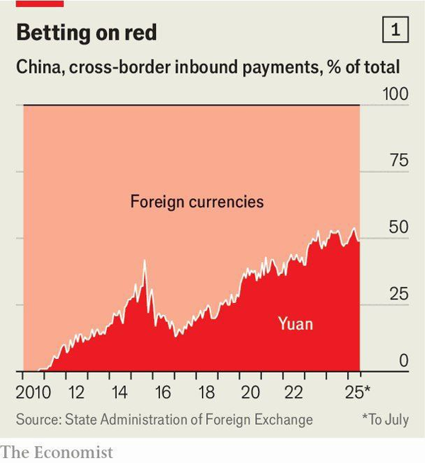 گروه اقتصادی خبرگزاری فارس؛ نشریه اکونومیست در گزارشی نوشت چین روند کاهش وابستگی به دلار در تجارت و مبادلات مالی خود را با سرعتی چشمگیر دنبال میکند. بر اساس این گزارش، بیش از ۳۰ درصد تجارت کالا و خدمات چین اکنون با ارز ملی این کشور، رنمینبی (یوان)، انجام میشود؛ رقمی که نشان از جهش بزرگ در استفاده از پول ملی در مبادلات خارجی دارد.همچنین آمارها نشان میدهد که بیش از ۵۰ درصد از کل دریافتهای فرامرزی چین، شامل جریانهای مالی و تراکنشهای بینالمللی با یوان تسویه میشود؛ در حالی که این عدد در سال ۲۰۱۰ کمتر از یک درصد بوده است.