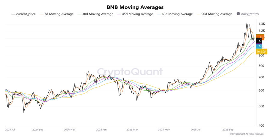 قیمت BNB در محدوده ۱،۱۳۰ دلار تثبیت شده و بالاتر از میانگین متحرک ۴۵ روزه قرار دارد. میانگینهای بلندمدت نیز صعودی هستند که نشان میدهد روند صعودی از اوایل فصل سوم ادامه داشته است. هر بار که قیمت این حمایت را آزمایش کرده، واکنش مثبت خریداران موجب افزایش مجدد قیمت شده است.در کل، شرایط کنونی، با نوسان فشرده و حجم معاملات مثبت، معمولاً پیشزمینه حرکات قوی و جهتدار است.