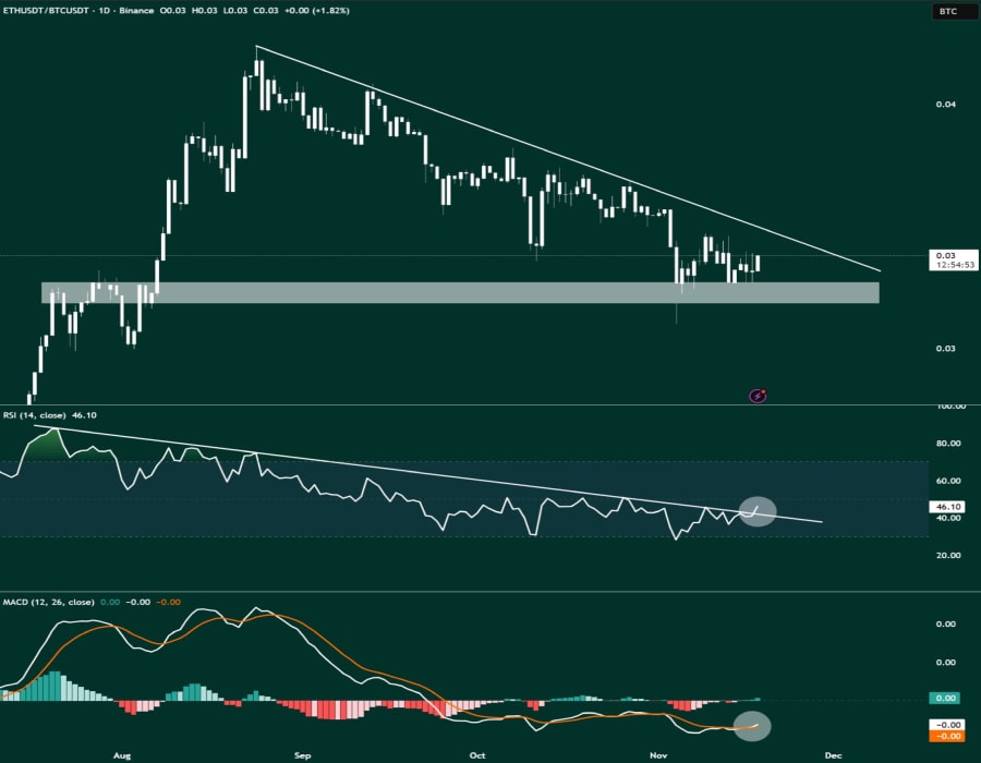 به گفته تحلیلگران، شاخص قدرت نسبی (RSI) در نمودار روزانه این جفتارز از مقاومت کلیدی عبور کرده و با ثبت صعودیترین الگوی تاریخ، نشان میدهد قدرت خرید در حال تقویت است. این اتفاق معمولاً زمانی رخ میدهد که سرمایهگذاران به سمت آلتکوینها متمایل میشوند و بازار در آستانه آلتسیزن قرار میگیرد.