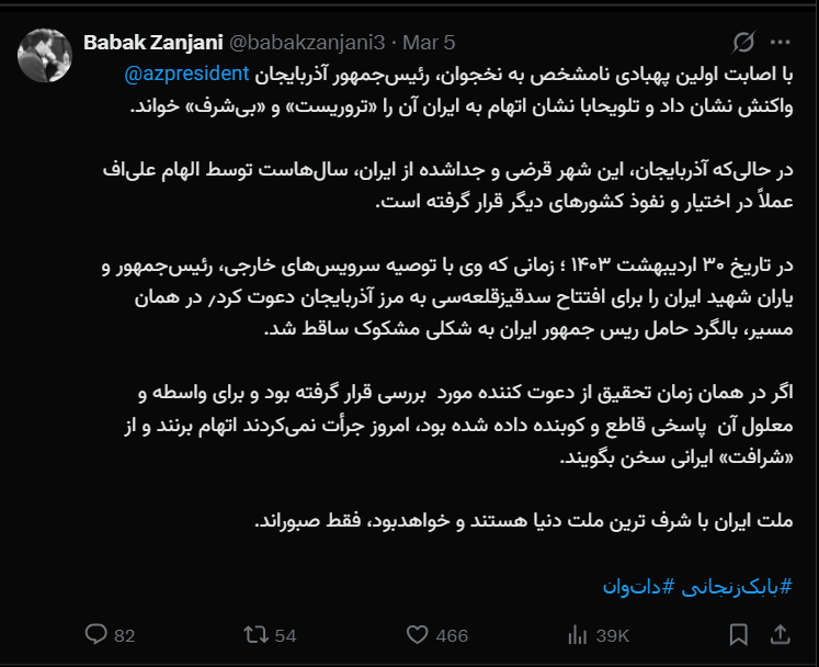 با اصابت اولین پهبادی نامشخص به نخجوان، رئیسجمهور آذربایجان @azpresident واکنش نشان داد و تلویحا با نشان اتهام به ایران آن را «تروریست» و «بیشرف» خواند.