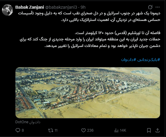 فاصله آن تا اورشلیم (قدس) حدود ۱۲۰ کیلومتر است.حملات جدید ایران به این منطقه میتواند ایران را وارد مرحله جدیدی از جنگ کند که برای دشمن جبران ناپذیر خواهد بود و تمام معادلات اسرائیل را تغییر میدهد.