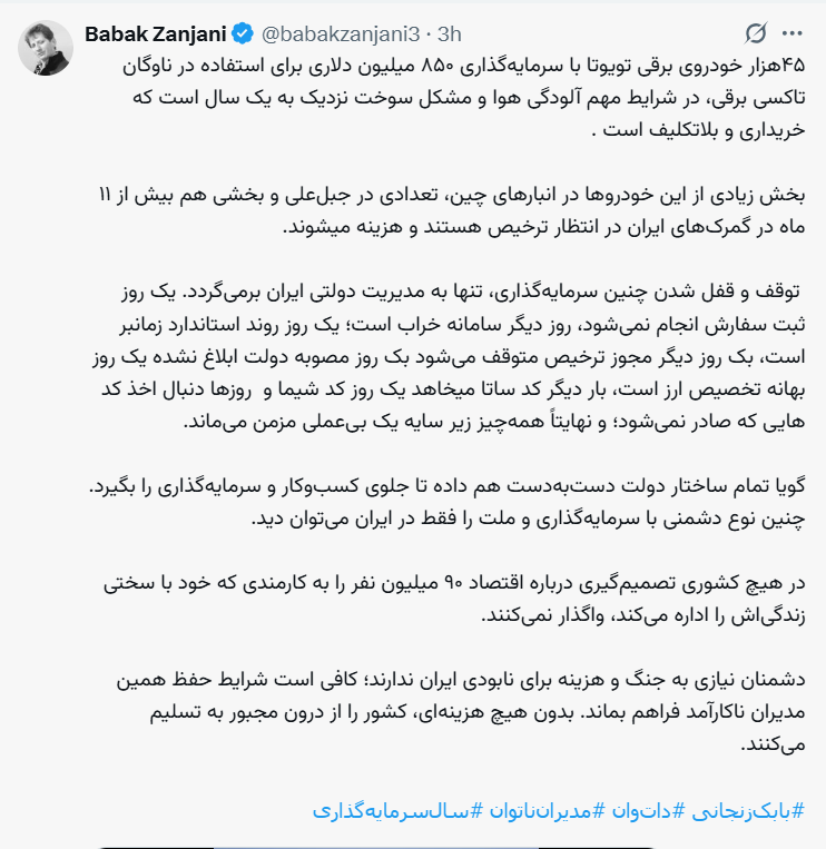 بخش زیادی از این خودروها در انبارهای چین، تعدادی در جبلعلی و بخشی هم بیش از ۱۱ ماه در گمرکهای ایران در انتظار ترخیص هستند و هزینه میشوند. توقف و قفل شدن چنین سرمایهگذاری، تنها به مدیریت دولتی ایران برمیگردد.
