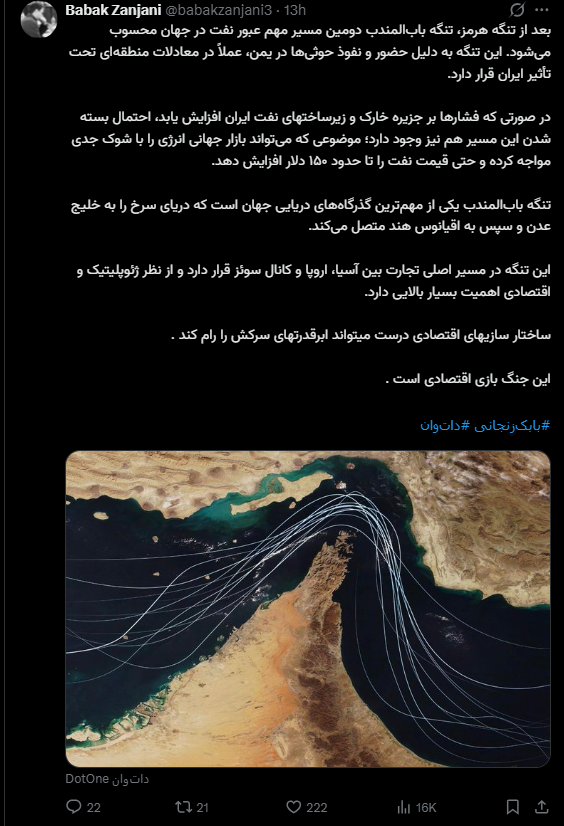 بعد از تنگه هرمز، تنگه بابالمندب دومین مسیر مهم عبور نفت در جهان محسوب میشود. این تنگه به دلیل حضور و نفوذ حوثیها در یمن، عملاً در معادلات منطقهای تحت تأثیر ایران قرار دارد.