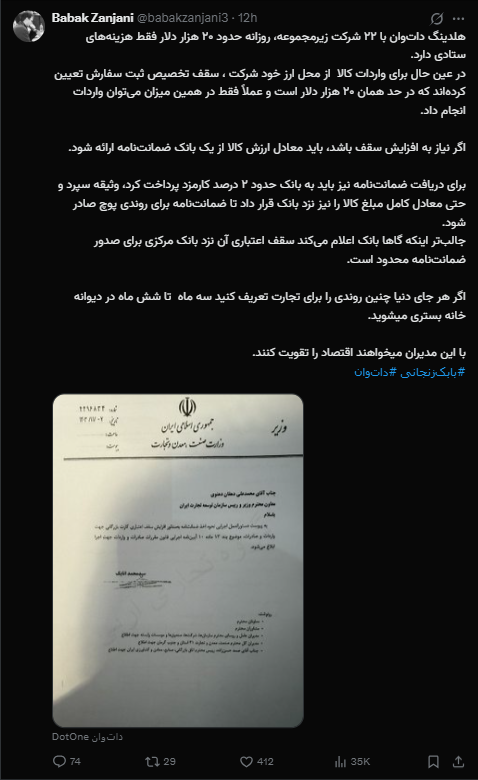 هلدینگ داتوان با ۲۲ شرکت زیرمجموعه، روزانه حدود ۲۰ هزار دلار فقط هزینههای ستادی دارد. در عین حال برای واردات کالا از محل ارز خود شرکت، سقف تخصیص ثبت سفارش تعیین کردهاند که در حد همان ۲۰ هزار دلار است و عملاً فقط در همین میزان میتوان واردات انجام داد.