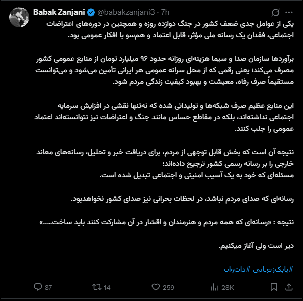 یکی از عوامل جدی ضعف کشور در جنگ دوازده روزه و همچنین در دورههای اعتراضات اجتماعی، فقدان یک رسانه ملی مؤثر، قابل اعتماد و همسو با افکار عمومی بود.