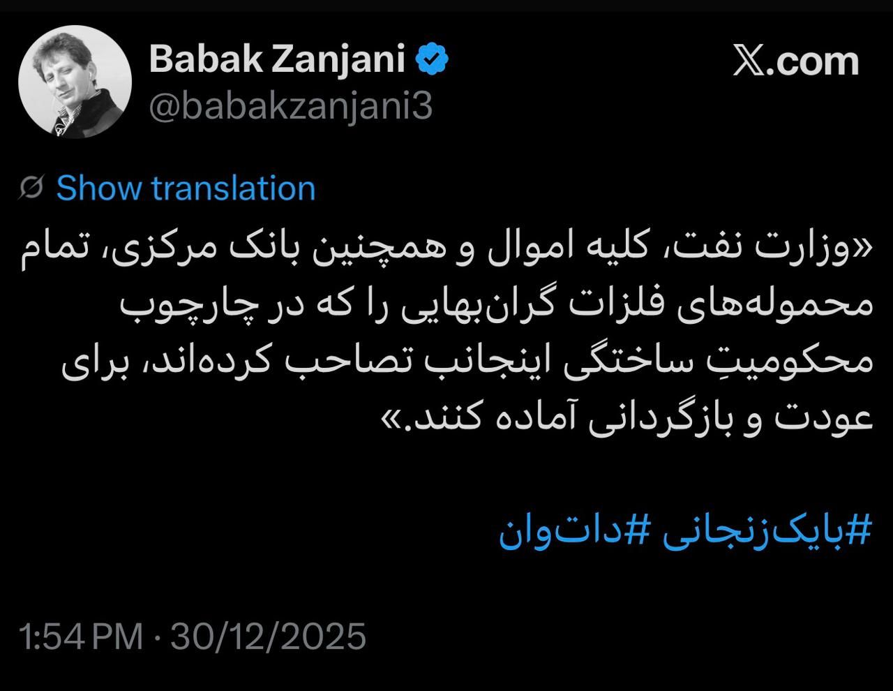 «وزارت نفت، کلیه اموال و همچنین بانک مرکزی، تمام محمولههای فلزات گرانبهایی را که در چارچوب محکومیتِ ساختگی اینجانب تصاحب کردهاند، برای عودت و بازگردانی آماده کنند.»