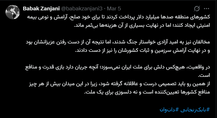 در واقعیت، هیچکس دلش برای ملت ایران نمیسوزد؛ آنچه جریان دارد بازی قدرت و منافع است.از همین رو باید تصمیمی درست و عاقلانه گرفته شود، زیرا در این میدان بیش از هر چیز منافع کشورها تعیینکننده است و نه دلسوزی برای یک ملت.