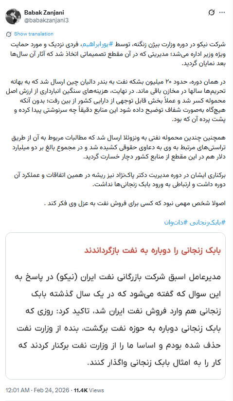 شرکت نیکو در دوره وزارت بیژن زنگنه، توسط #پورابراهیم، فردی نزدیک و مورد حمایت ویژه وزیر اداره میشد؛ مدیریتی که در آن مقطع تصمیماتی اتخاذ شد که آثار آن سالها بعد نمایان گردید.