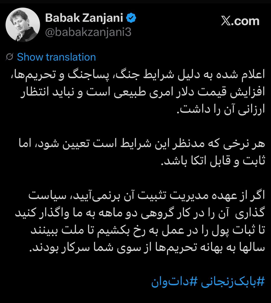 اگر از عهده مدیریت تثبیت آن برنمیآیید، سیاست گذاری آن را در کار گروهی دو ماهه به ما واگذار کنید تا ثبات پول را در عمل به رخ بکشیم تا ملت ببینند سالها به بهانه تحریمها از سوی شما سرکار بودند.
