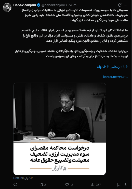 مسببانی که با سوءمدیریت، تصمیمات نادرست و لجبازی با مطالبات مردم، زمینهساز شورشها، کشتهشدن جوانان کشور و نابودی اقتصاد ملی شدهاند، باید بدون هیچ ملاحظهای مورد رسیدگی و محاکمه قرار گیرند.