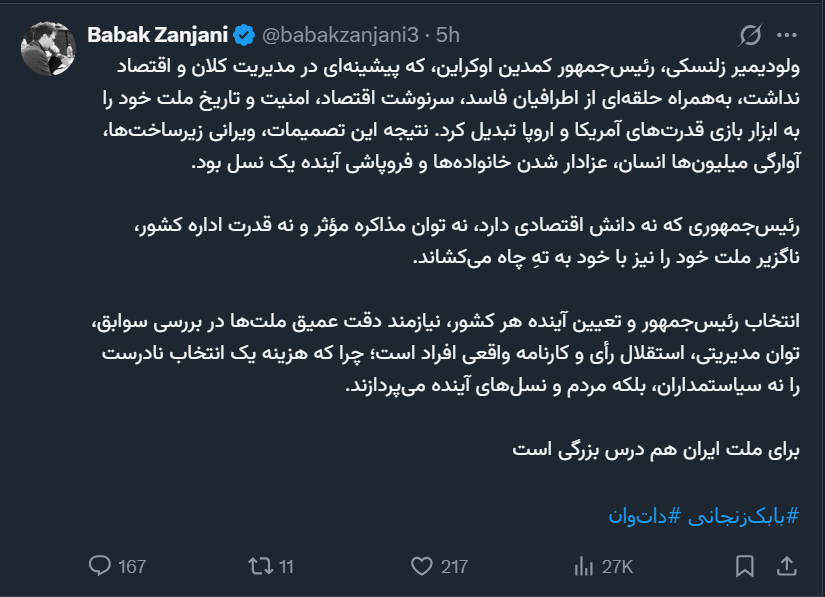 ولودیمیر زلنسکی، رئیسجمهور کمدین اوکراین، که پیشینهای در مدیریت کلان و اقتصاد نداشت، بههمراه حلقهای از اطرافیان فاسد، سرنوشت اقتصاد، امنیت و تاریخ ملت خود را به ابزار بازی قدرتهای آمریکا و اروپا تبدیل کرد. نتیجه این تصمیمات، ویرانی زیرساختها، آوارگی میلیونها انسان، عزادار شدن خانوادهها و فروپاشی آینده یک نسل بود.
