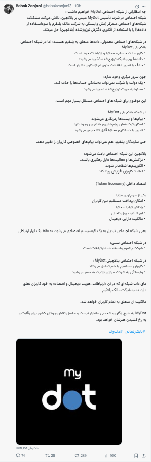چه انتظاراتی از شبکه اجتماعی MyDot خواهیم داشت :شبکه اجتماعی در شرف تأسیس MyDot مبتنی بر بلاکچین، تلاش میکند مشکلات شبکههای اجتماعی متمرکز (مثل وابستگی به شرکت مالک پلتفرم یا سوءاستفاده از دادهها) را با استفاده از فناوری دفترکل توزیعشده (بلاکچین) حل میکند.