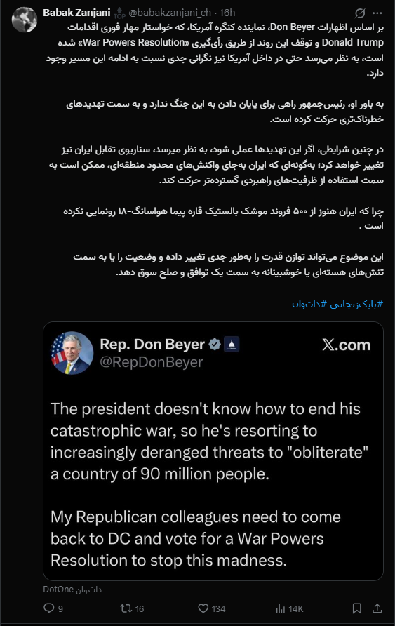 بر اساس اظهارات Don Beyer، نماینده کنگره آمریکا، که خواستار مهار فوری اقدامات Donald Trump و توقف این روند از طریق رأیگیری «War Powers Resolution» شده است، به نظر میرسد حتی در داخل آمریکا نیز نگرانی جدی نسبت به ادامه این مسیر وجود دارد.