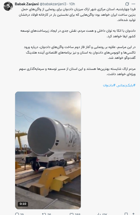 فردا چهارشنبه، استان مرکزی شهر اراک میزبان داتوان برای رونمایی از واگنهای حمل بنزین ساخت ایران خواهد بود؛ واگنهایی که برای نخستین بار در کارخانه فولاد درخشان تولید شدهاند.