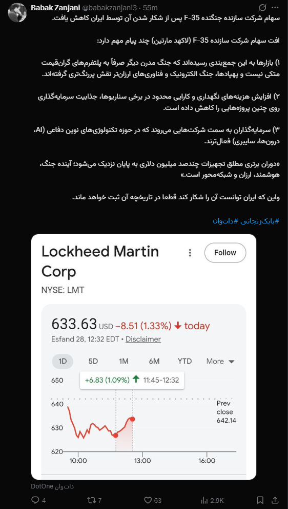 سهام شرکت سازنده جنگنده F-35 پس از شکار شدن آن توسط ایران کاهش یافت.