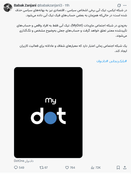 بهزودی در شبکه اجتماعی مایدات (MyDot)، تیک آبی فقط به افراد واقعی و حسابهای تأییدشده معتبر تعلق خواهد گرفت و حسابهای جعلی بهوضوح مشخص و تگگذاری میشوند.