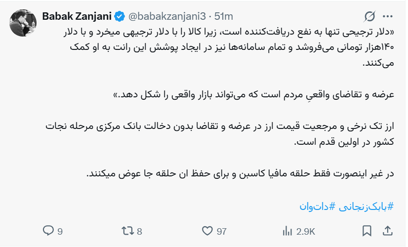 «دلار ترجیحی تنها به نفع دریافتکننده است، زیرا کالا را با دلار ترجیهی میخرد و با دلار ۱۴۰هزار تومانی میفروشد و تمام سامانهها نیز در ایجاد پوشش این رانت به او کمک میکنند.