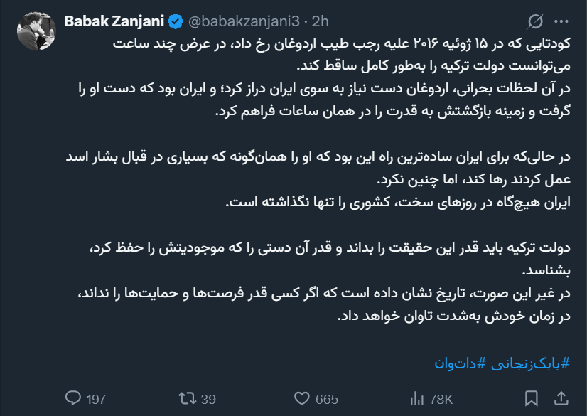 در آن لحظات بحرانی، اردوغان دست نیاز به سوی ایران دراز کرد؛ و ایران بود که دست او را گرفت و زمینه بازگشتش به قدرت را در همان ساعات فراهم کرد.