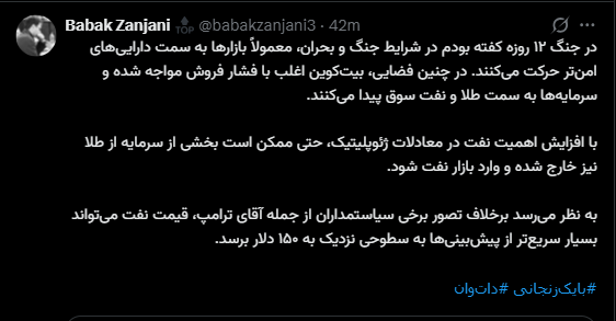 در جنگ ۱۲ روزه کفته بودم در شرایط جنگ و بحران، معمولاً بازارها به سمت داراییهای امنتر حرکت میکنند. در چنین فضایی، بیتکوین اغلب با فشار فروش مواجه شده و سرمایهها به سمت طلا و نفت سوق پیدا میکنند.