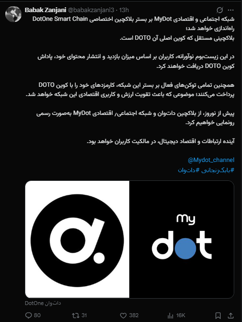 شبکه اجتماعی و اقتصادی MyDot بر بستر بلاکچین اختصاصی DotOne Smart Chain راهاندازی خواهد شد؛بلاکچینی مستقل که کوین اصلی آن DOTO است.