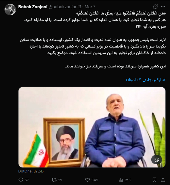 لازم است رئیسجمهور، به عنوان نماد قدرت و اقتدار یک کشور، ایستاده و با صلابت سخن بگوید؛ سر را بالا بگیرد و با قاطعیت در برابر کسانی که به کشور تجاوز کردهاند یا اجازه دادهاند از خاکشان برای تجاوز به این سرزمین استفاده شود، موضع بگیرد.