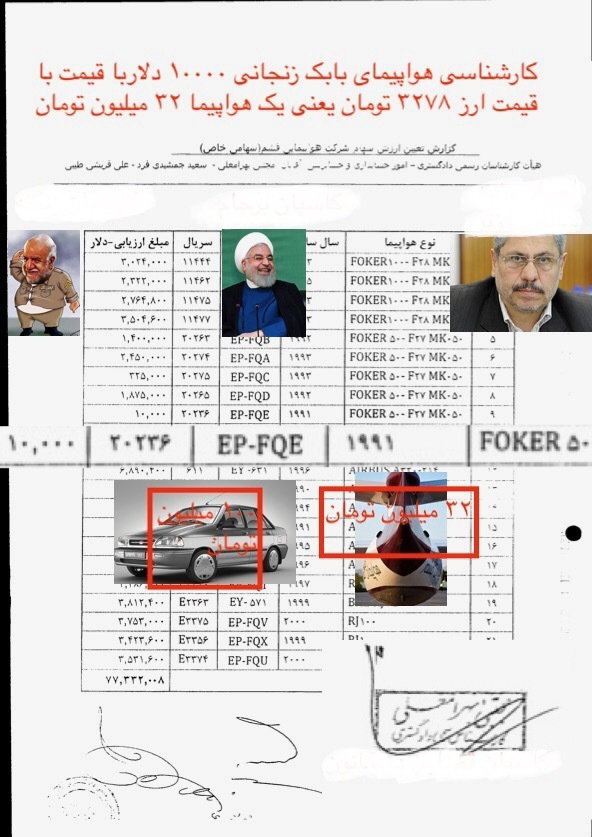کارشناس وزیر نفت اقای زنگنه هواپیمای مربوط به بابک زنجانی را به مبلغ ۳۲ میلیون تومان کارشناسی و به اقای زنگنه داده بودند و در دادگاه بابک زنجانی ناراحت از این غارت اعلام کردهواپیما که هیچ حتی ماشینم را اتش بزنید و به اقای زنگنه ندهید .