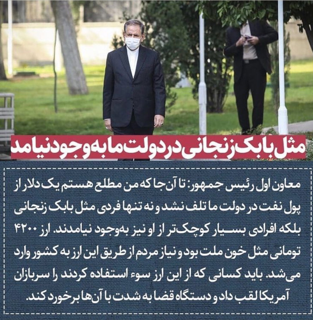 به گزارش خبرگزاری دولتی ایرنا، او میافزاید: در سال ۹۸ وقتی دیدیم که نمی توانیم نفت به اندازه کافی بفروشیم، در زمینه برخی کالاها مثل شکر، برنج و لاستیک کامیون به سمت تولید داخل رفتیم و هر جا جواب نداد رویکرد واردات با ارز دولتی در پیش گرفته شد.[۴]*کاش آقای جهانگیری این دقتهای بیان شده را در بحث توزیع ارز ۴۲۰۰ تومانی هم به خرج میدادند تا ویروس بابک زنجانی تکثیر نشود.اقدامات دولت محترم در پیشبرد امورات کشور قابل تحسین است اما ادعای جهانگیری مبنی بر بوجود نیامدن حتی یک بابک زنجانی کوچک در حالی است که تنها در فقره "توزیع ارز ۴۲۰۰ تومانی" به حدی شاهد سوء مدیریت آقای جهانگیری و مدیران تحت امر او بودیم که دهها بابک زنجانی قد و نیم قد از درون سوء مدیریت دولت متولد شد و شرکتها و افراد بسیاری بودند که ارز دولتی را ستادند و به جای وارد کردن قانونی مایحتاج کشور؛ به دنبال مطامع خود رفتند.پروندهای حجیم و مایه تأسف که البته دولت و شخص آقای جهانگیری هرگز پاسخ قانعکنندهای نسبت به این سستی مدیریتی و بیکفایتی ندادند.به این تحفه عجیب دولت اعتدال البته بایستی پرونده "حقوقهای نجومی" را نیز افزود.مدیرانی که زرنگتر از بابک زنجانی بودند و با امضای بیتالمال پول بیتالمال را تحت عنوان حقوق ماهیانه و سرفصلهای آن به یغما میبردند و اگر نبود افشاگری رسانهای؛ معلوم نبود که شکمچرانی آنها بر سر سفره بیتالمال تا کجا طول میکشید؟به زندان اقتصادی افتادن برادر رئیس جمهور و داماد این یکی وزیر، حواشی اقتصادی دختر آن یکی وزیر و خراب شدن ویلای غیر مجاز آن دیگر وزیر کابینه هم رخدادهای خاصی هستند که فقط در دولت آقای جهانگیری و دوستانشان شاهد آن بودیم و بسا که مضارّ آنها از ۱۰ بابک زنجانی هم بزرگتر بود.بایستی تأکید کرد که راه استشفای این معضل در سطح اجرائیات کشور چیزی جز "رأی خوب" و انتخاب صحیح مردم نیست و آنها هستند که تعیین میکنند کدام تفکر اجرایی و با کدام کارنامه بایستی در انتخابات سال ۱۴۰۰ بر مسند اجرائیات کشور قرار گیرد تا پروندههایی اینچنین شکل نگیرد.